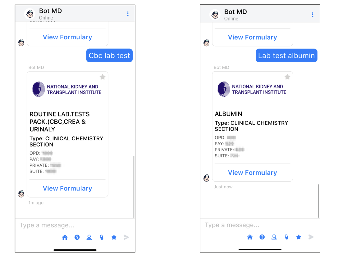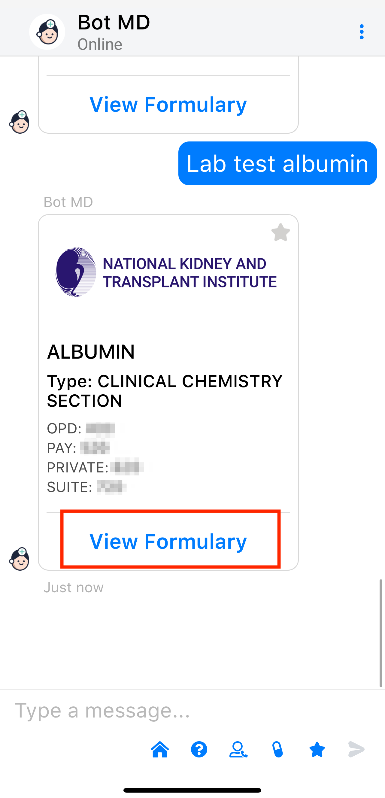 Bot MD helps you to search your institution's Lab Services for information on prices and available information.