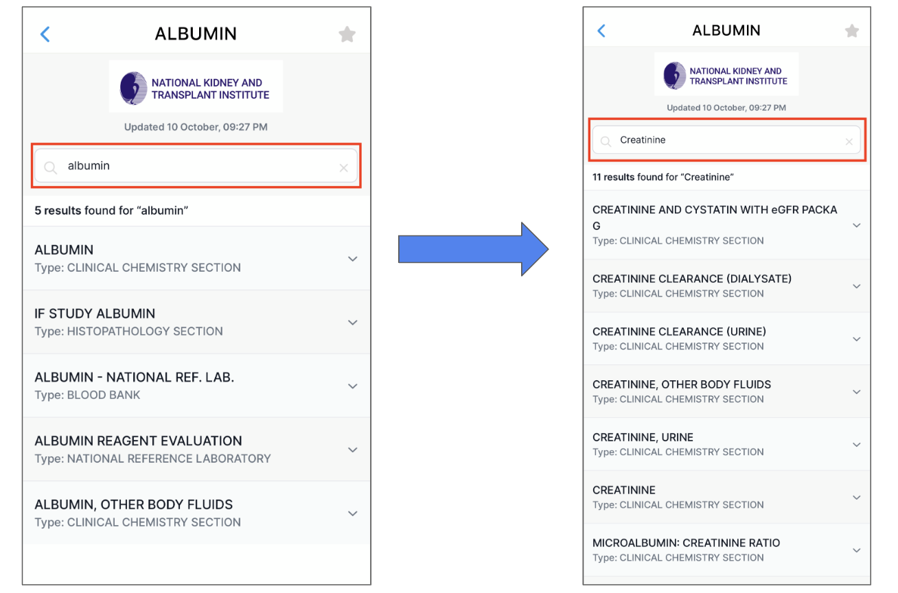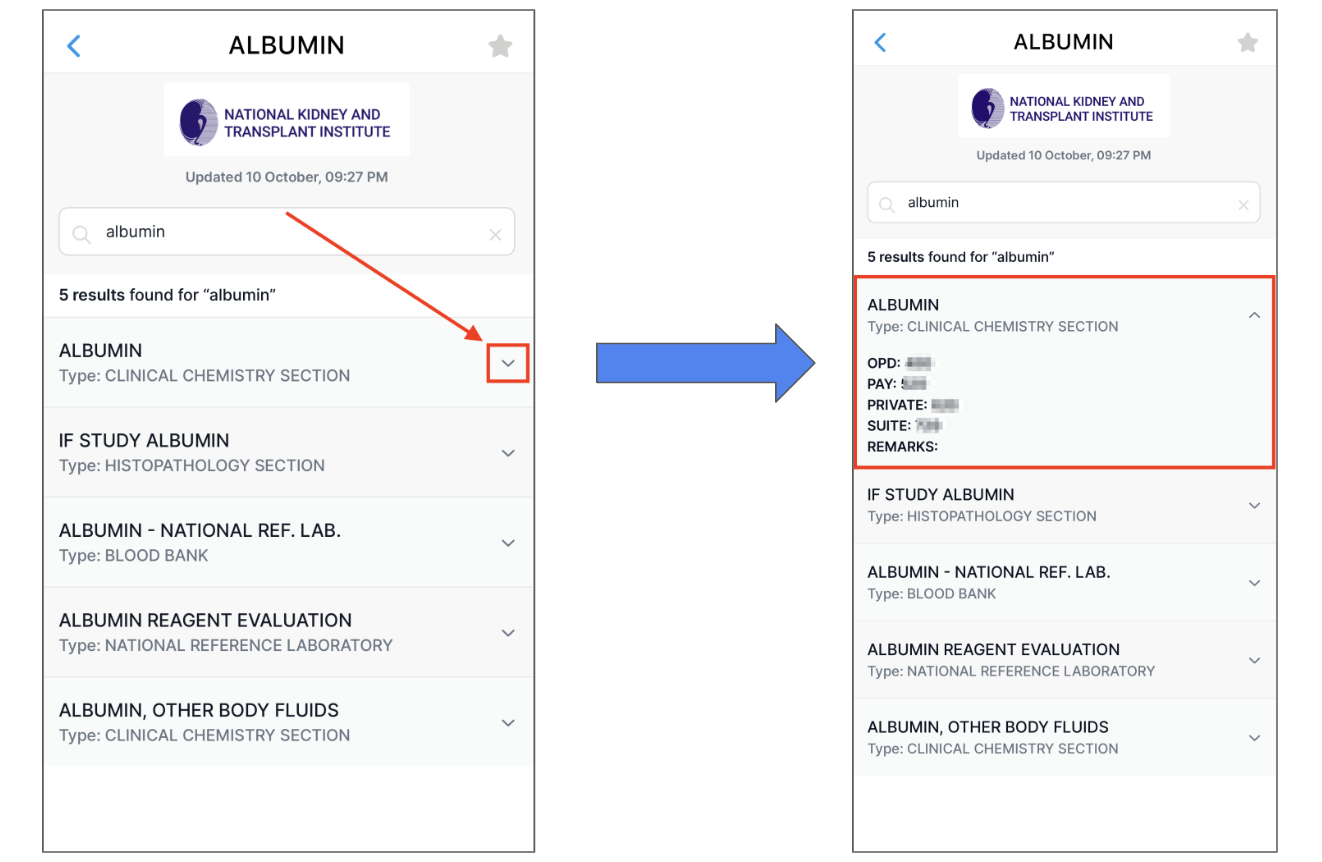3. Your search terms will be pre-filled within the formulary. Tap on the arrow down or the name of the lab test result to view more information.