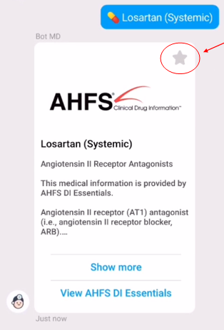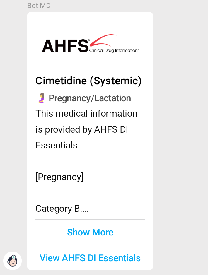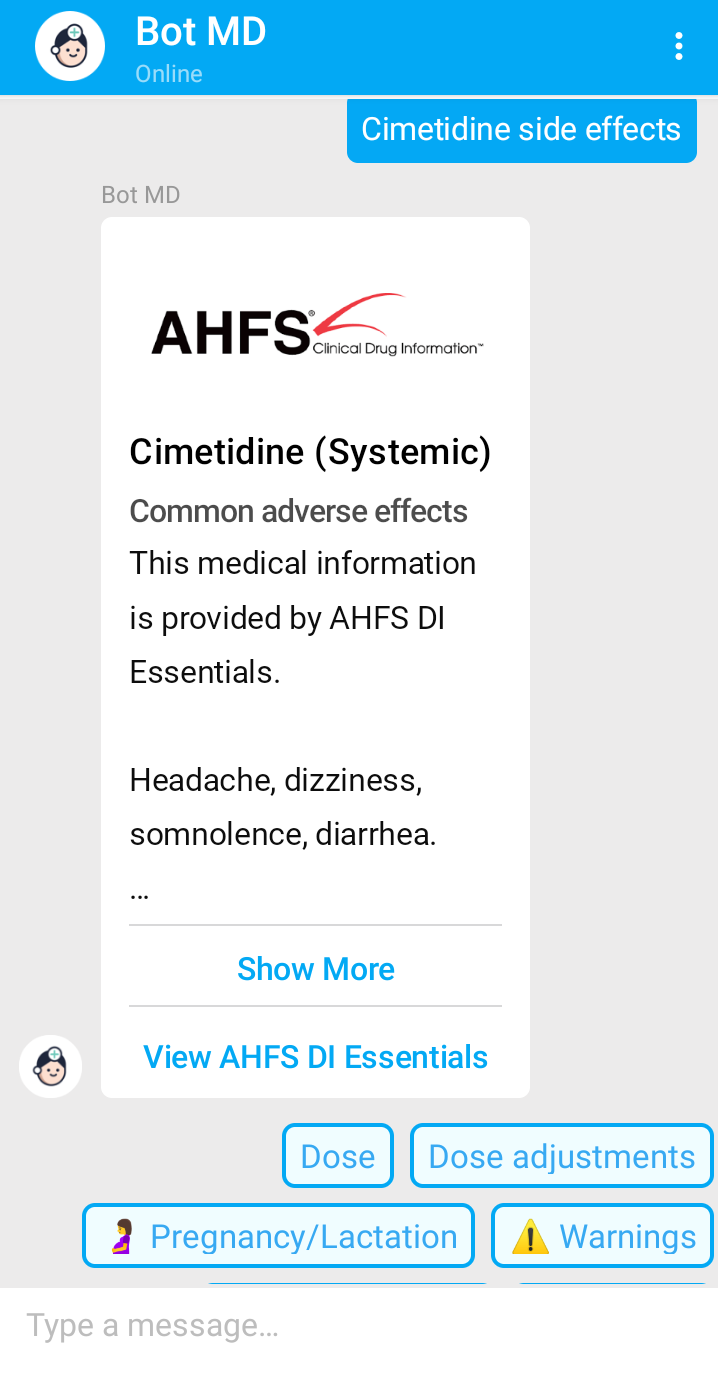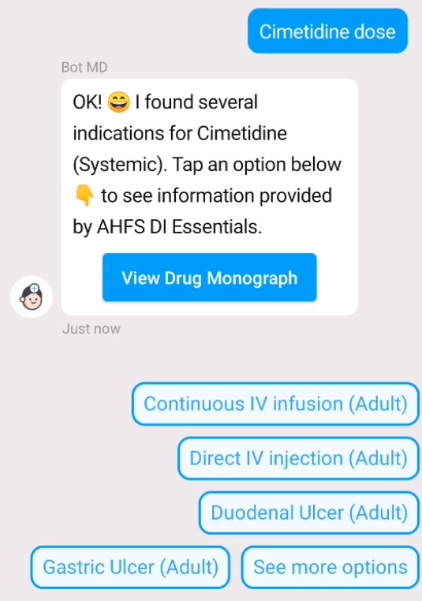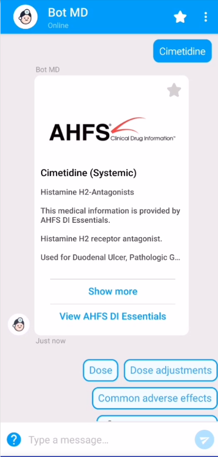 2. Bot MD will return a response from AHFS DI Essentials about th drug you searched.