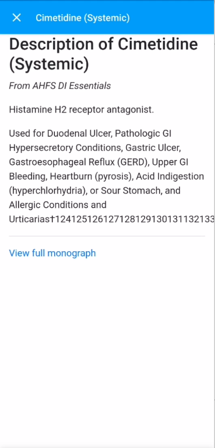 5. Tap "View full monograph" at the bottom with blue fonts to view full monograph from AHFS DI Essentials.