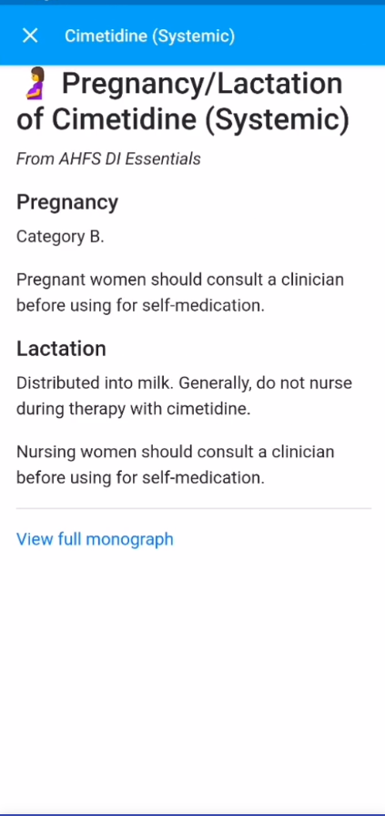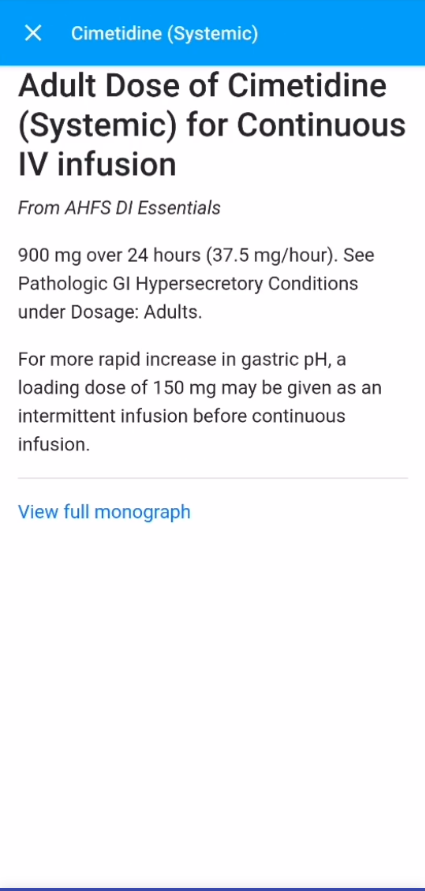 4. Tap " View full monograph" at the bottom with blue fonts to view the full monograph from AHFS DI Essentials.