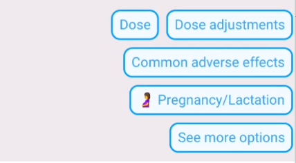 At the bottom of the screen, you will see quick options to select which aspect of the drug you would like to view (e.g. Dose, Common adverse effects etc.). Select a quick option at this point to receive more targeted information.
