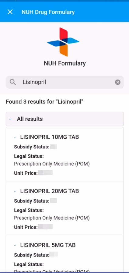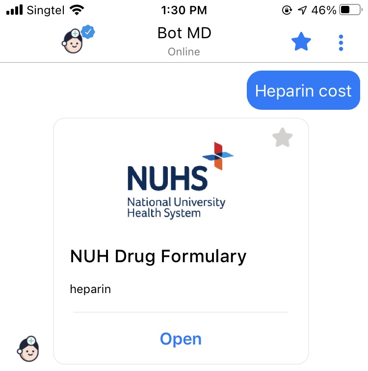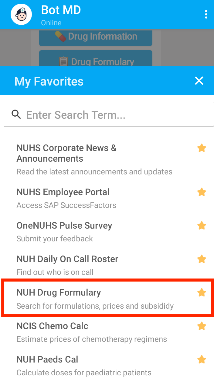 Bot MD helps you to search your institution's Pharmacy for information on prices, available formulations, subsidy statuses and more.