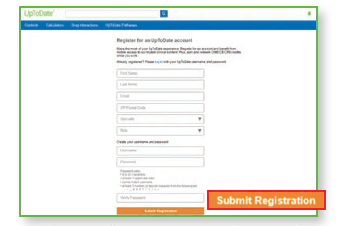 - Fill out the registration form and click Submit Registration. Do take note of your UpToDate username and password.