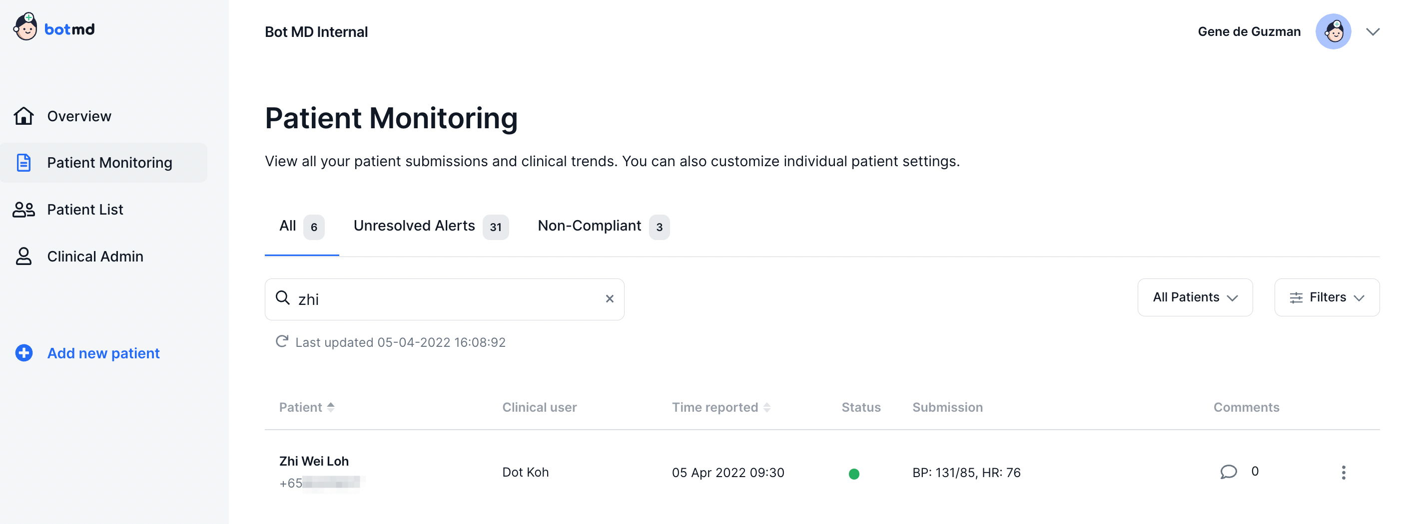 2. Select the All tab to see a list of all patients currently being monitored. You may type the patient's name in the search field or select from the list below.