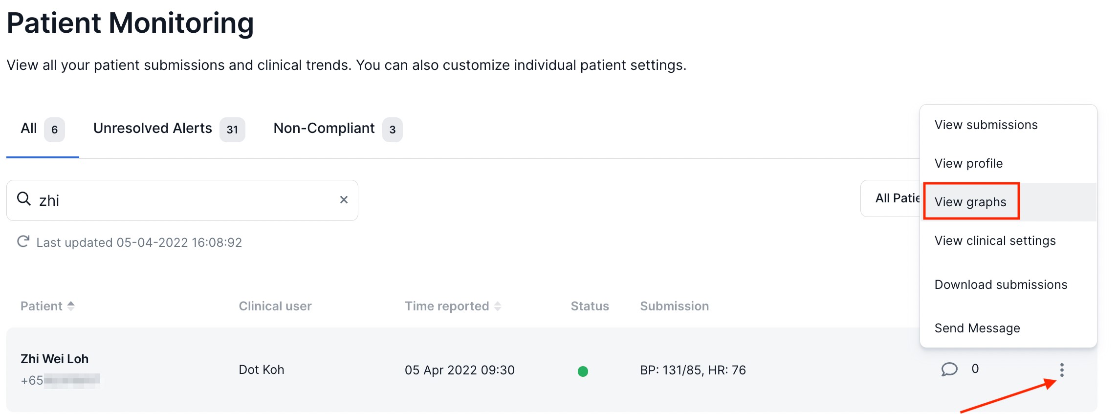 1. In the left side of the Clinical Dashboard, Click Patient List and search for your patient, then click on More Settings then select View submissions.