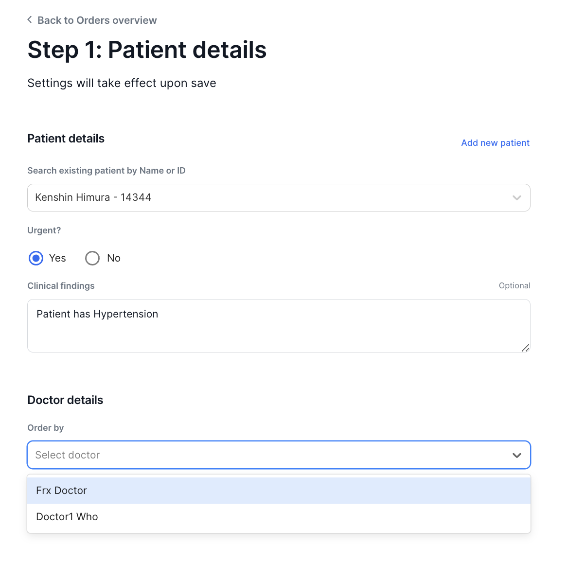 - Select the appropriate urgency of the exam ordered and key in any clinical findings. Then select from the drop down list the Name of the Doctor who ordered the exam