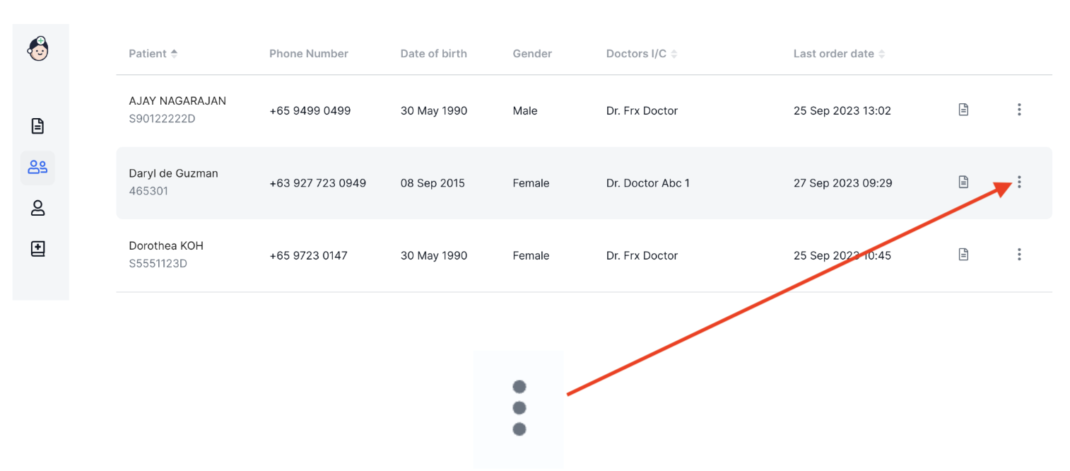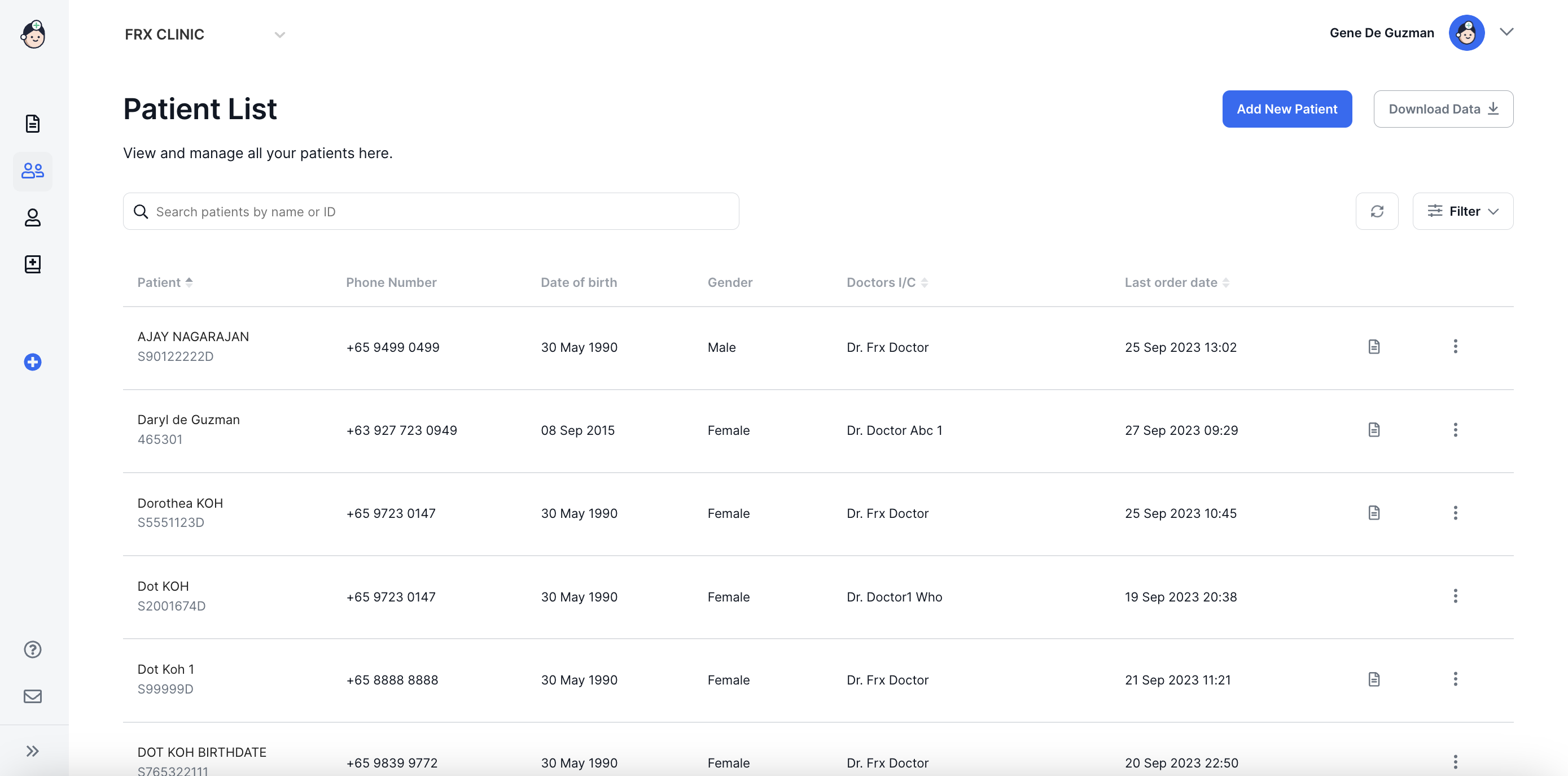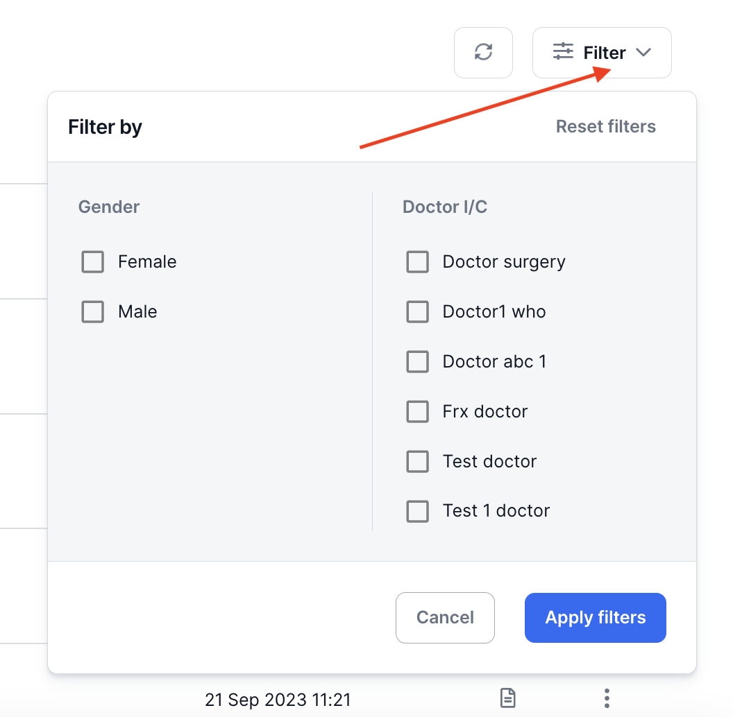 You can use filters to change the list of patients displayed by Gender and Doctor I/C.