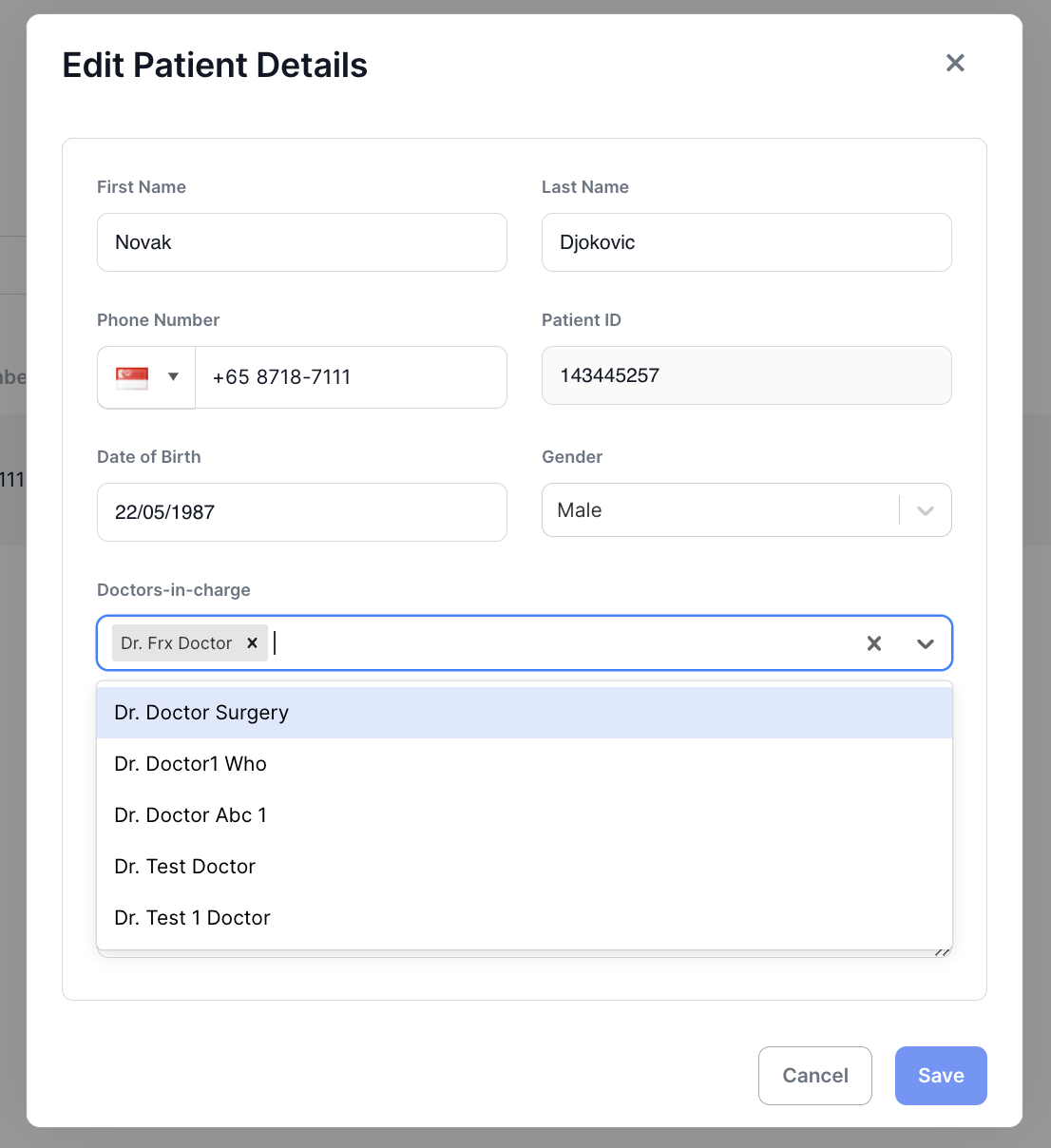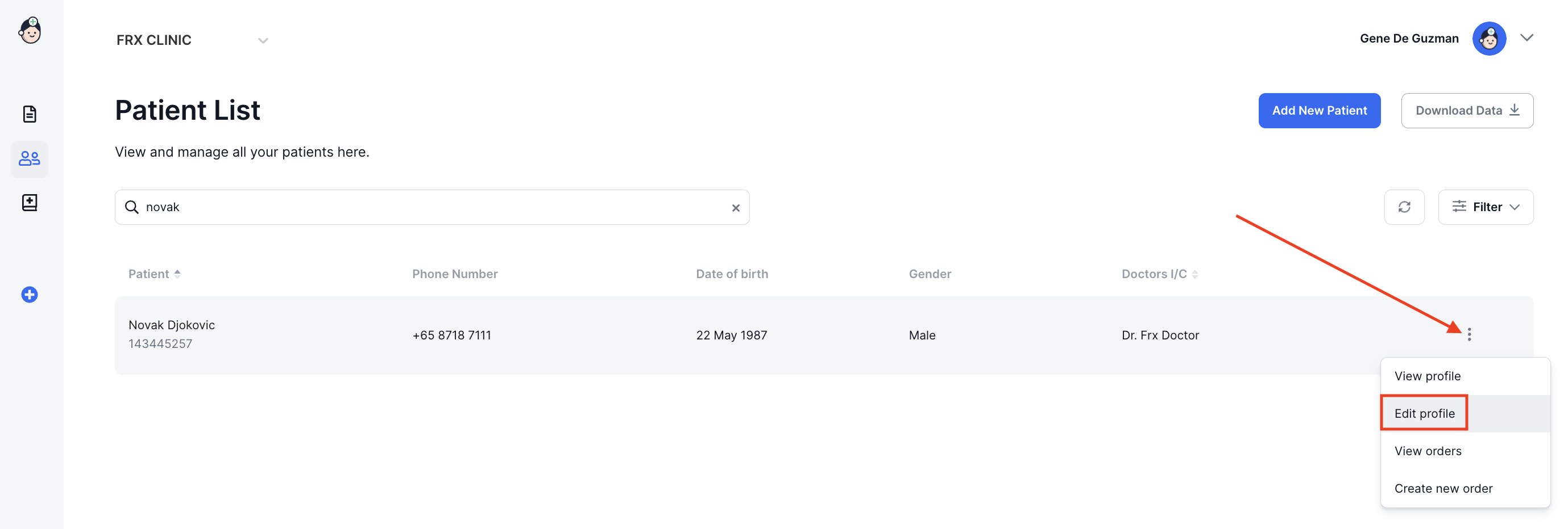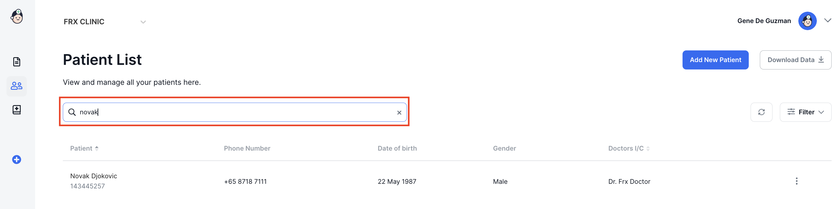 - In Patient List, search for your patient by typing her/his name or number in the search field.