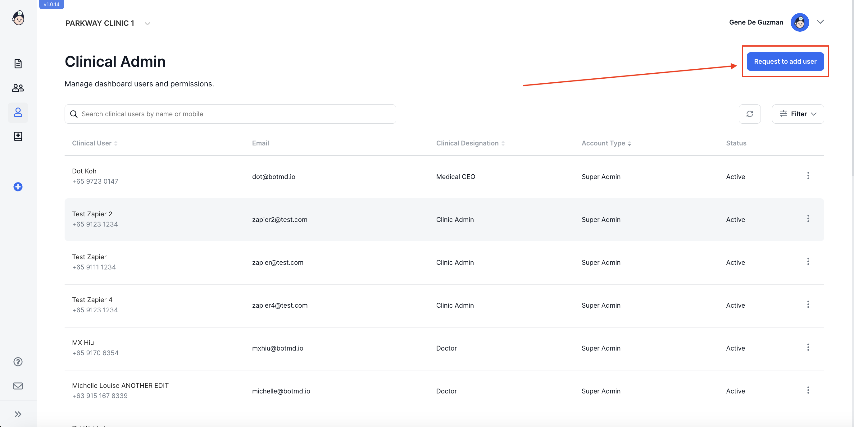 - In the Clinical Admin page click on the Request to Add user button on the upper right of the screen.