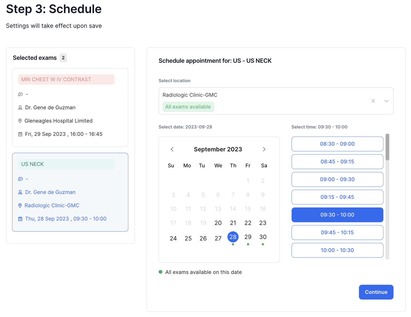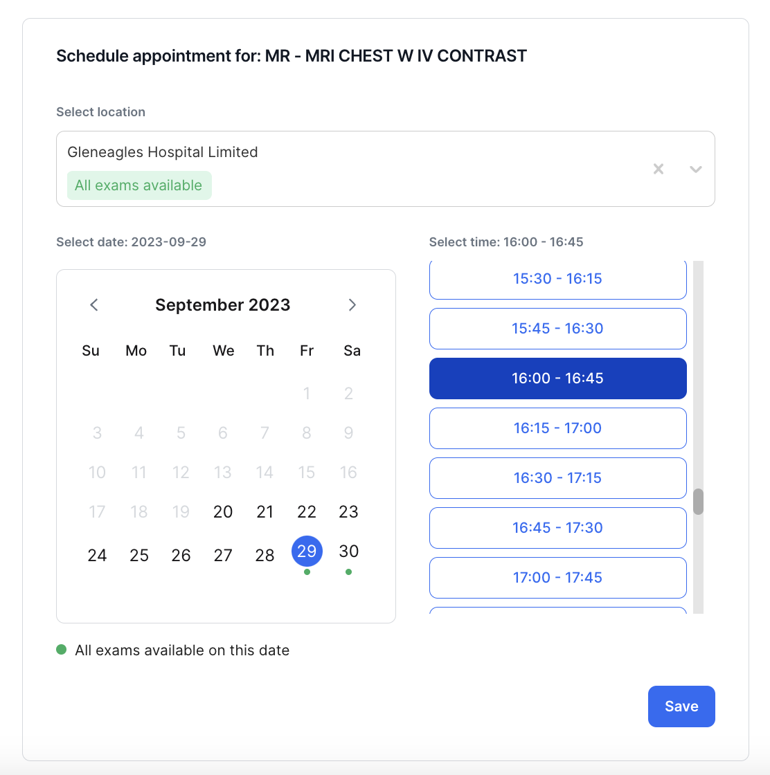 - Select a location where the patient will have the exam. Note that if you have selected multiple exams the list indicates if all selected exams are available in that particular location.