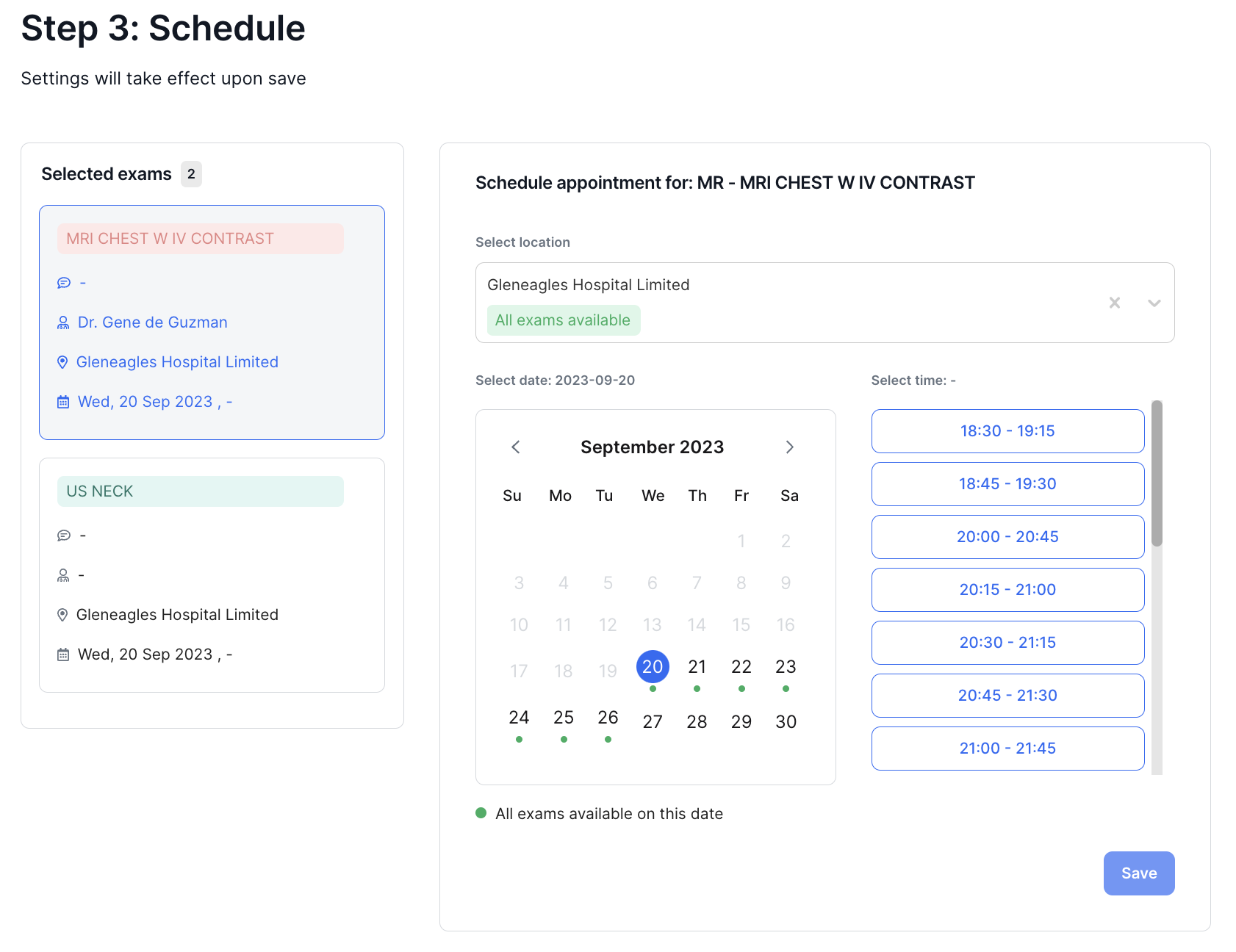 3. Select a date from the calendar, then select an available time slot from the right. Click on Save to set the time schedule.